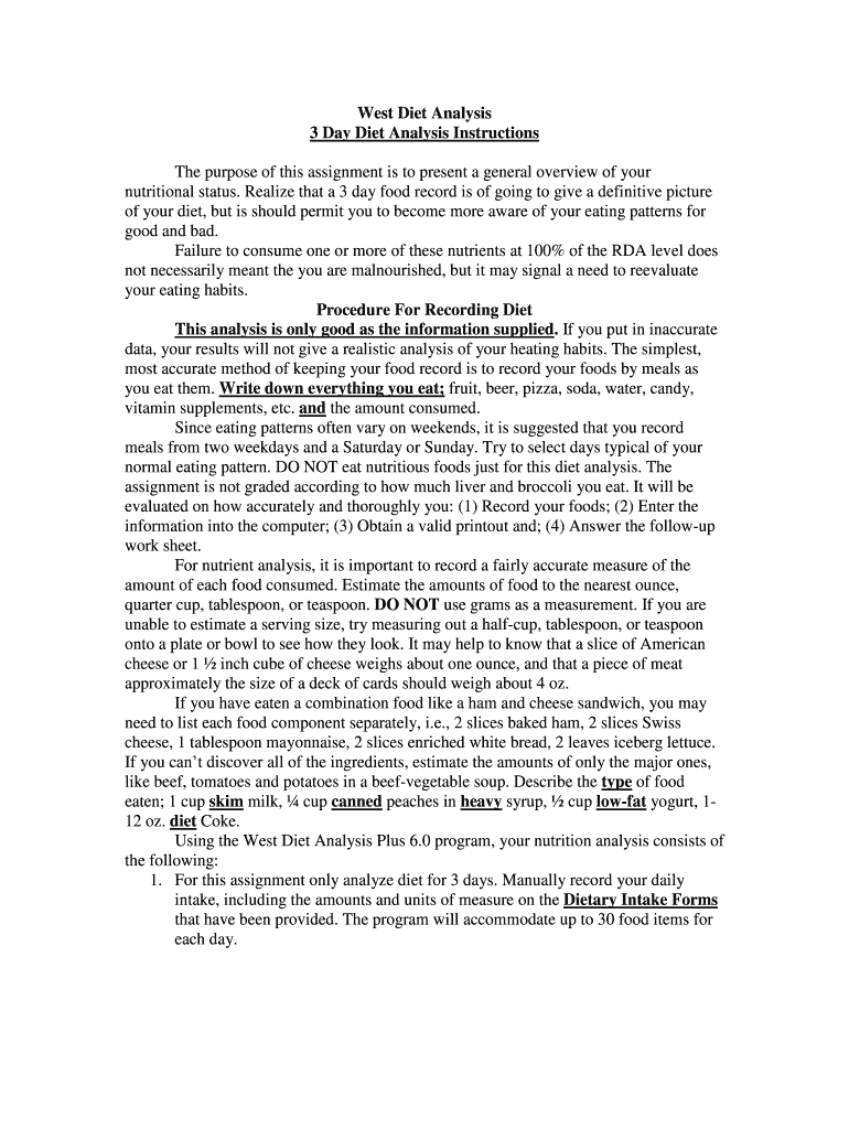 The West Diet Analysis Form is a dietary intake document used by students to record and analyze their food consumption over three days.
