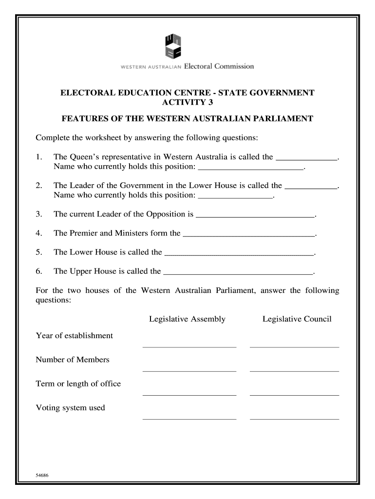Worksheet for understanding the structure and key positions within the Western Australian Parliament.