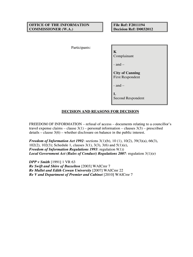 Get the free Re K and the City of Canning and L [2012] WAICmr 3 - foi wa gov