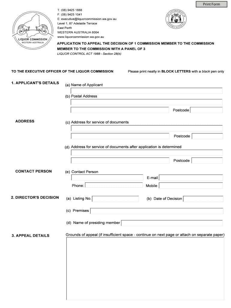 This document is an application form for appealing the decision made by a single member of the Liquor Commission to a panel of three members under the Liquor Control Act 1988.