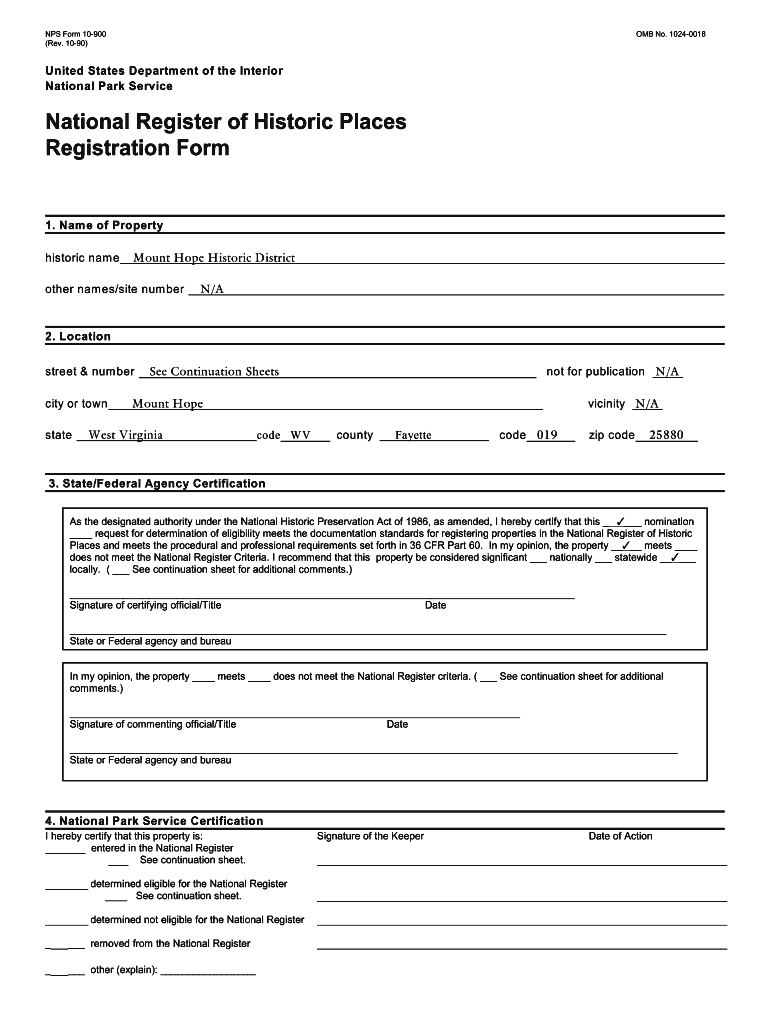 This document serves to record the Mount Hope Historic District for inclusion in the National Register of Historic Places, detailing its history, significance, descriptions of its properties, and