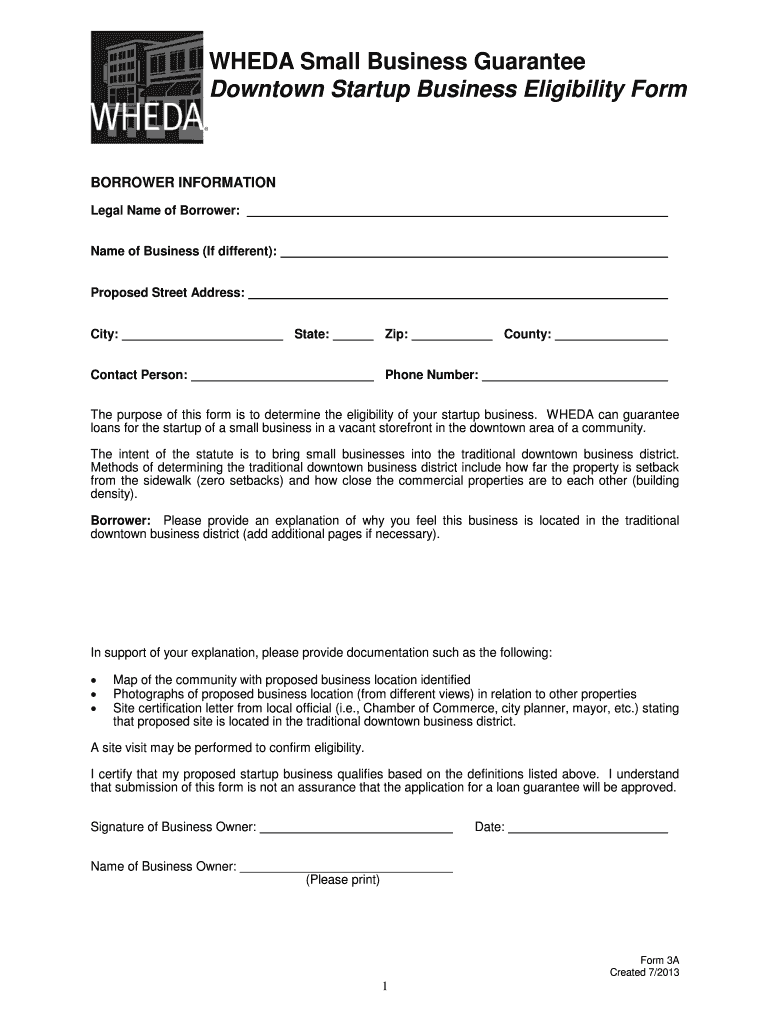 This form is designed to determine the eligibility of a startup business for a loan guarantee by WHEDA, specifically for businesses located in the traditional downtown business district.