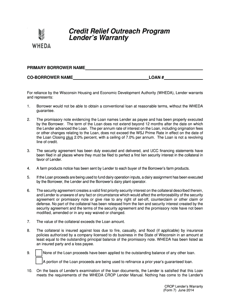 This document serves as a warranty by the Lender to the Wisconsin Housing and Economic Development Authority (WHEDA) regarding the terms and conditions of a loan provided to a borrower, outlining