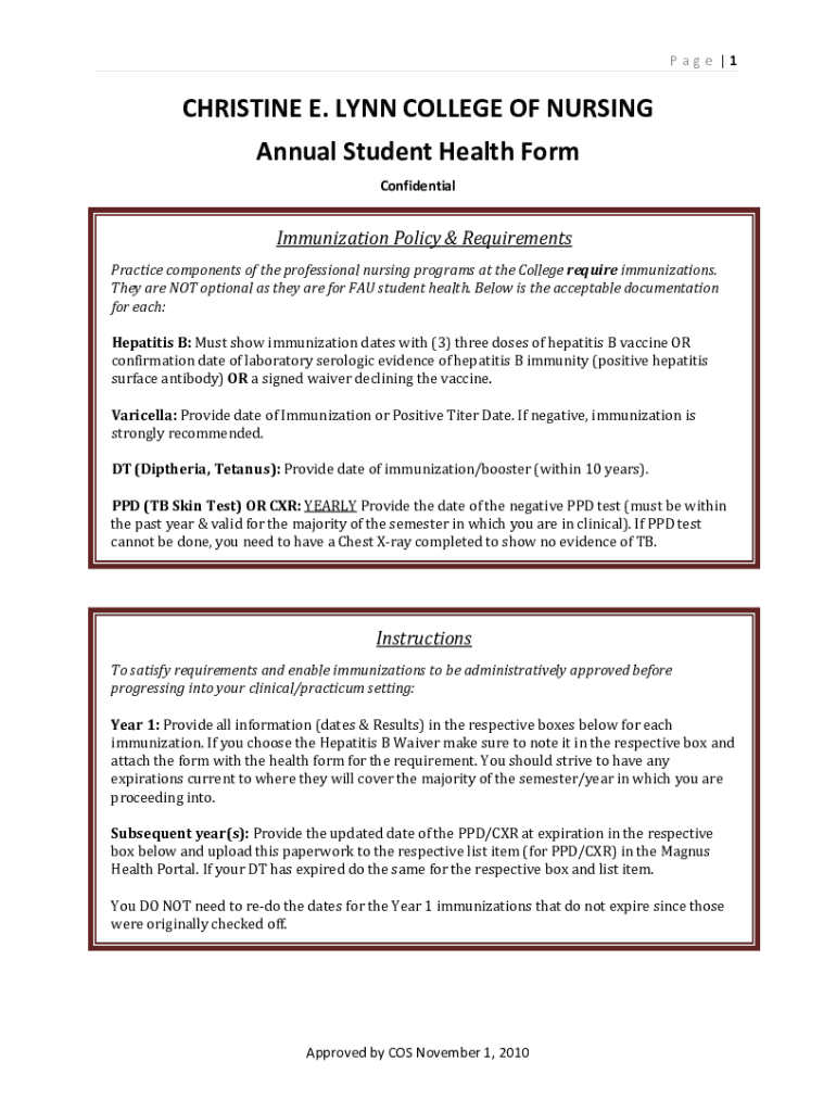 The Annual Student Health Form is essential for nursing students at Christine E. Lynn College of Nursing. This document serves to verify that students have completed the necessary health documentation required for their program. The form mandates students to detail their immunization history and current health status, helping them comply with nursing school health form standards and student health requirements.