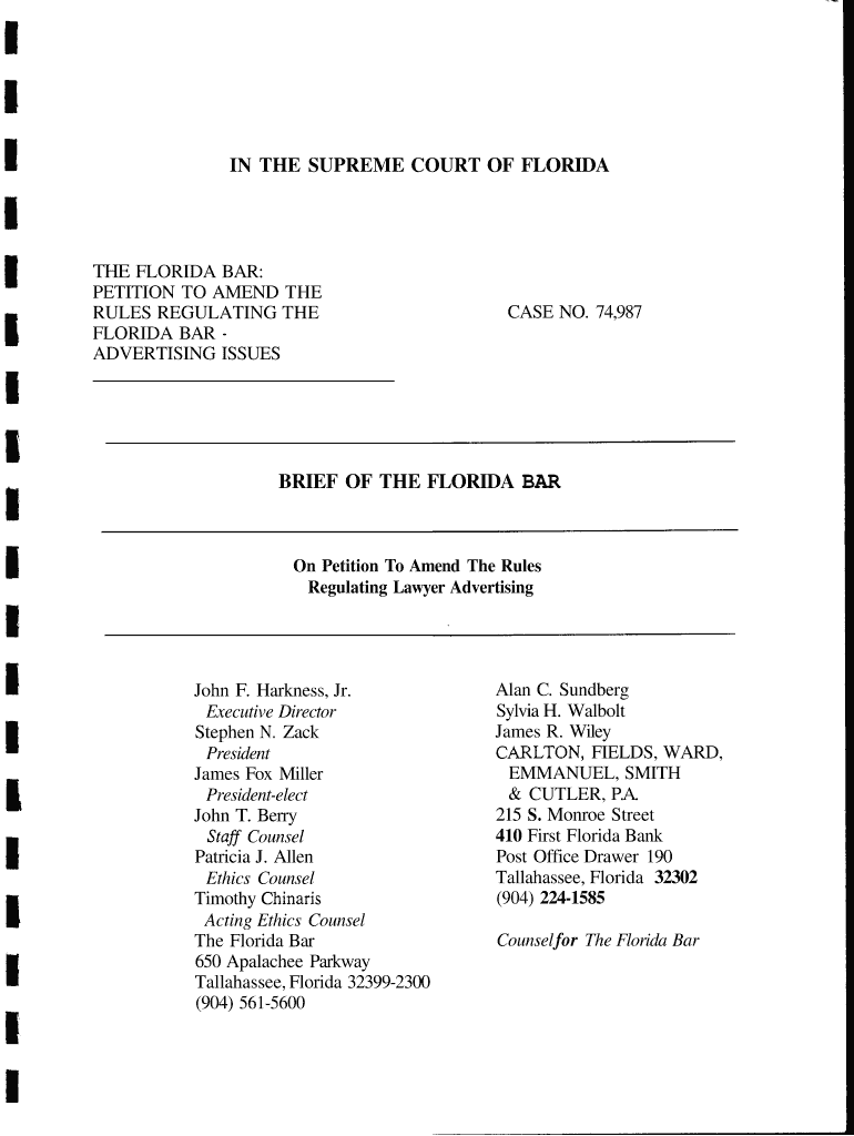 This document is a brief filed by The Florida Bar in the Supreme Court of Florida, outlining proposed amendments to the rules governing lawyer advertising. The document discusses the findings of a
