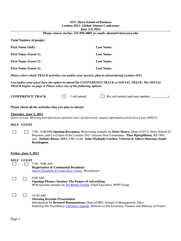 This document is a registration form for the NYU Stern School of Business Global Alumni Conference in London, scheduled from June 2-5, 2011. It includes sections for attendees' names, guest names,