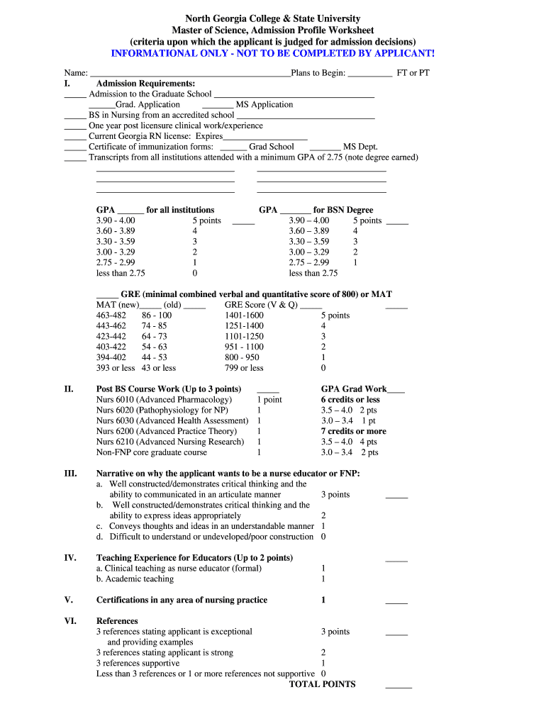 Get the free North Georgia College & State University Master of Science Admission Profile Workshe...