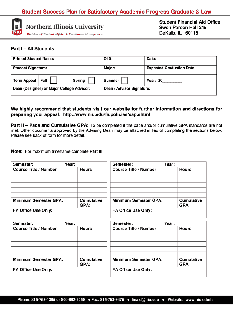 The Satisfactory Academic Progress Appeal Form is a document used by graduate and law students at Northern Illinois University (NIU) to appeal for continued financial aid eligibility due to extenuating circumstances.