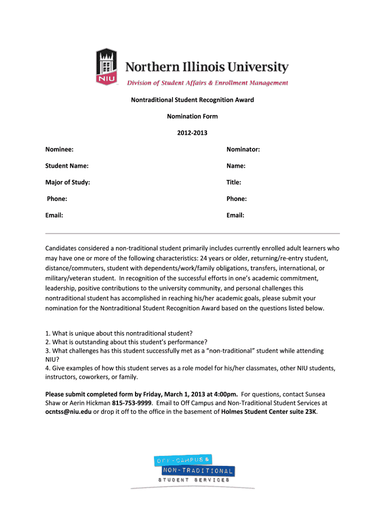 Get the free Nonttraditional Student Recognition Award Nomination Form - niu