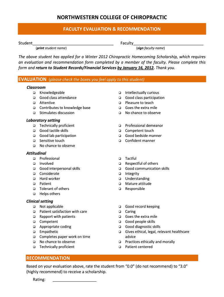 This document is a form for faculty to evaluate and recommend students applying for the Winter 2012 Chiropractic Homecoming Scholarship at Northwestern College of Chiropractic.