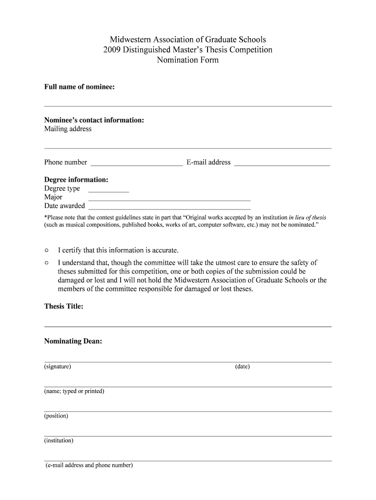 A form used to nominate candidates for the 2009 Distinguished Master’s Thesis Competition organized by the Midwestern Association of Graduate Schools.