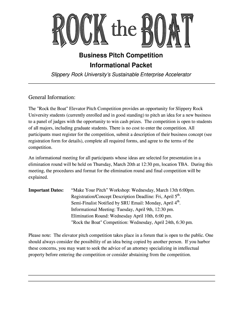 This document provides information about the 'Rock the Boat' Elevator Pitch Competition at Slippery Rock University, including rules, important dates, and registration details for participants.