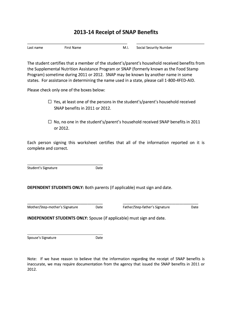 The SNAP Benefits Receipt Form is an official document used by students to certify household receipt of Supplemental Nutrition Assistance Program (SNAP) benefits during 2011 or 2012.