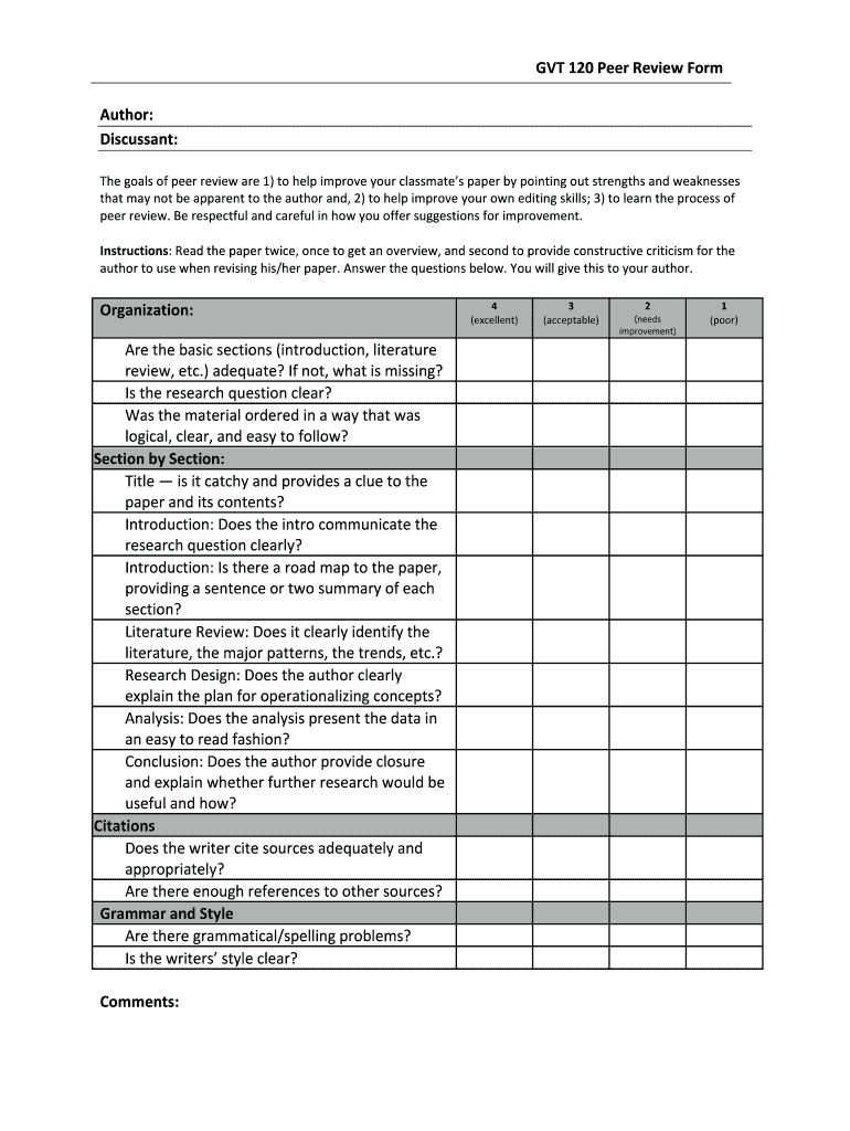 The Peer Review Form includes sections for assessing organization, research questions, material order, citations, grammar, style, and areas for additional comments, allowing for a comprehensive evaluation.