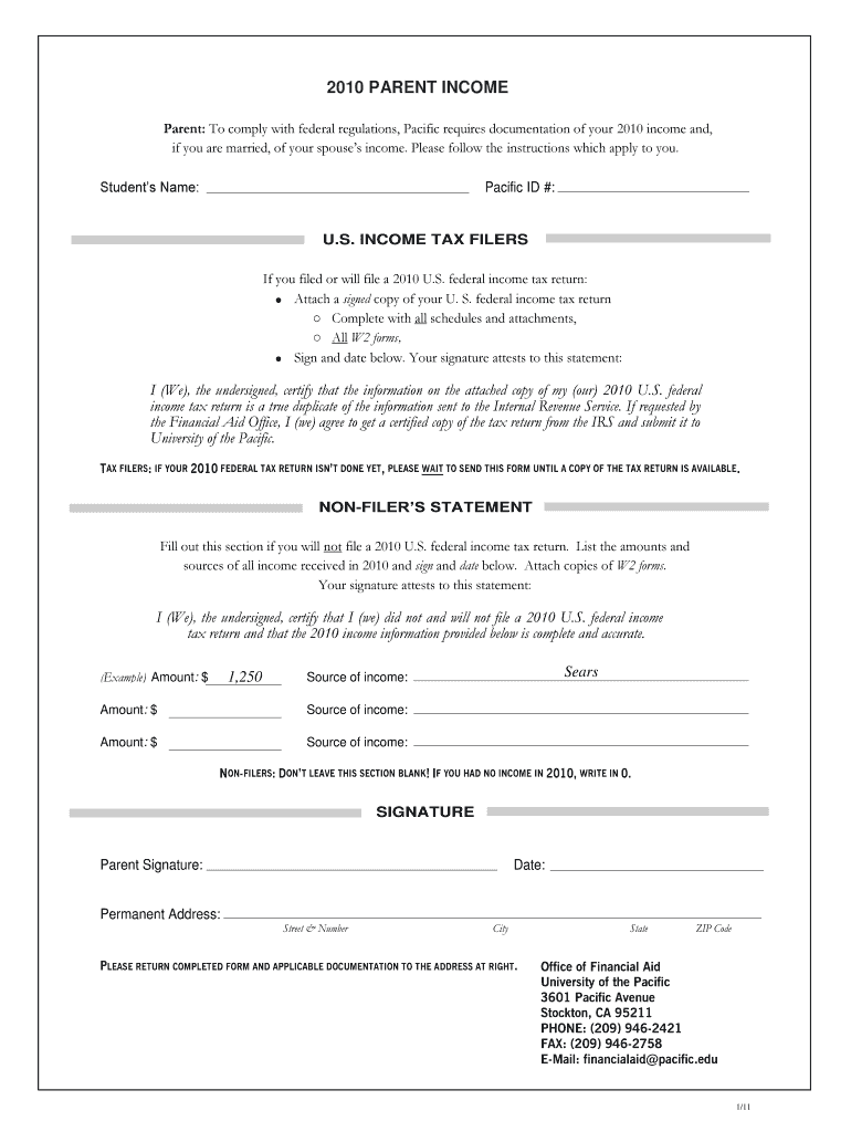 Parents must attach a signed copy of their 2010 U.S. federal income tax return or, if they did not file a tax return, a non-filer’s statement to document their income.