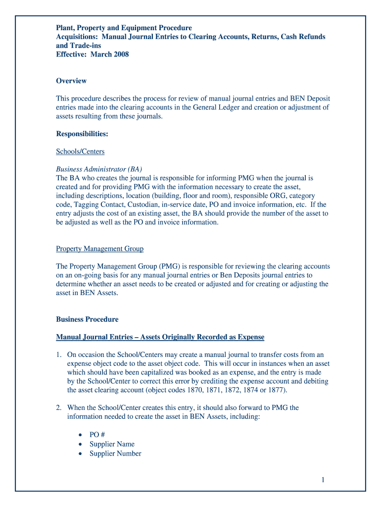 This procedure outlines the process for reviewing manual journal entries and BEN Deposit entries in the clearing accounts of the General Ledger, as well as the creation or adjustment of assets resulting