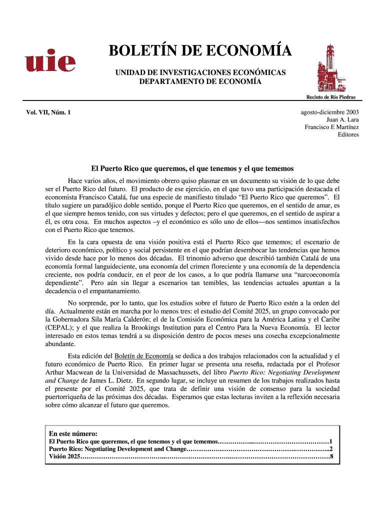 BOLT N DE ECONOMY A ewe UNITED DE INVESTIGATIONS ECON MICA DEPARTMENT DE ECONOMY A Rec into de R o Piers Vol. VII, N m. 1 agosto-diciembre 2003 Juan A. Lara Francisco E Mart new Editors El Puerto