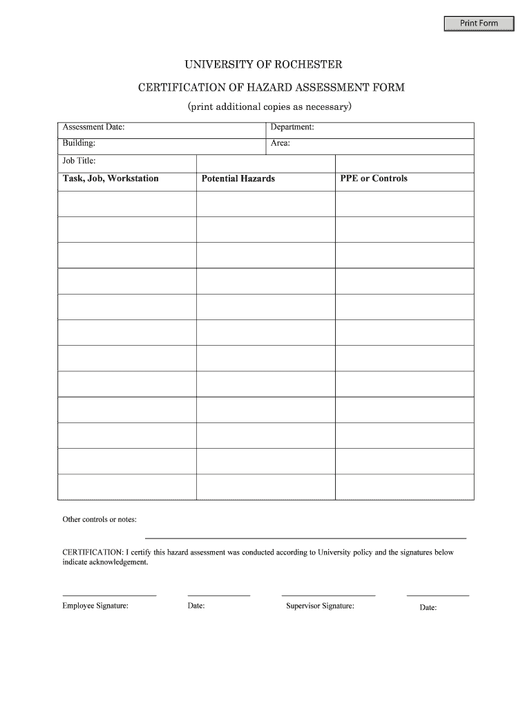 The form must report details such as the job location, the types of hazards identified, assessment findings, recommended control measures, and signatures of the person conducting the assessment.