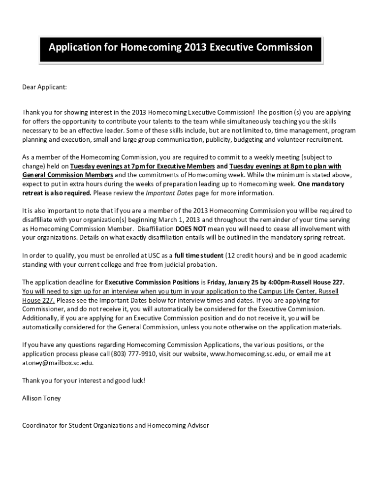 This document is an application form for students interested in joining the 2013 Homecoming Executive Commission at USC. It outlines the responsibilities, eligibility criteria, and important dates