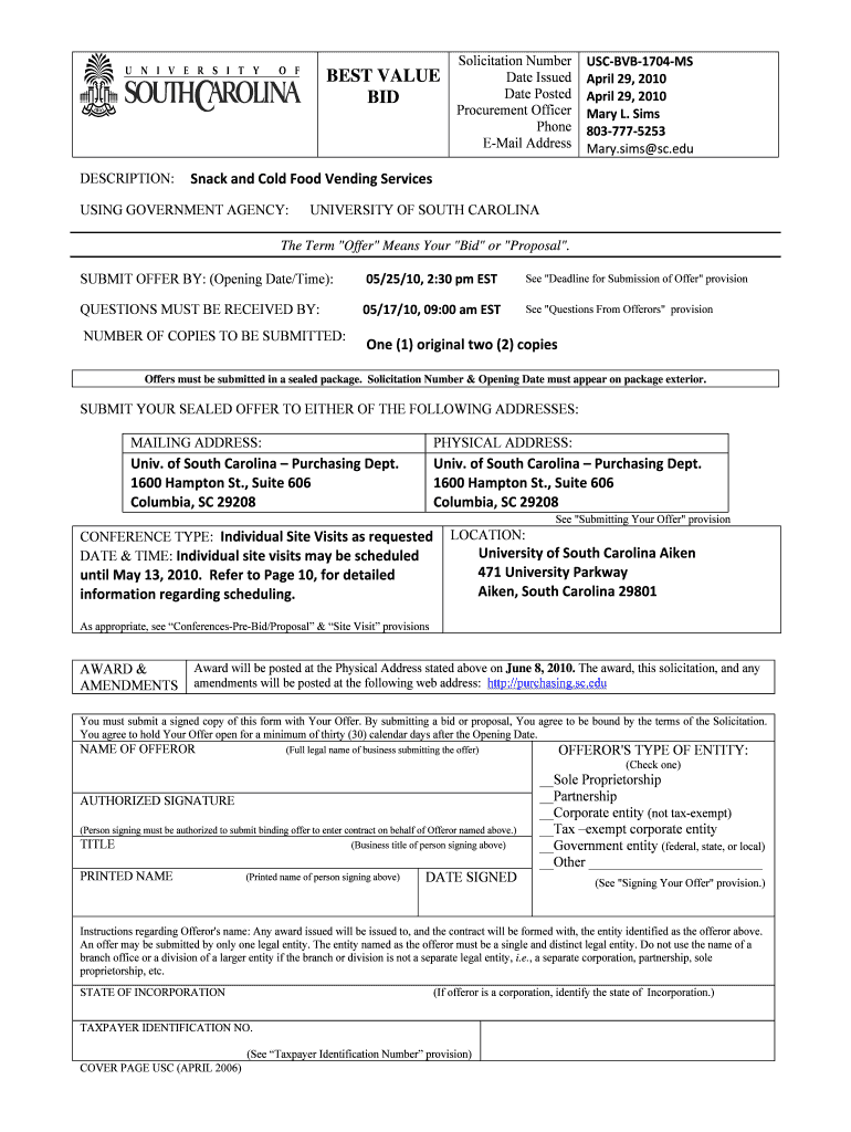 This document outlines the solicitation for Snack and Cold Food Vending Services at the University of South Carolina Aiken, including submission instructions, requirements, evaluation criteria, and