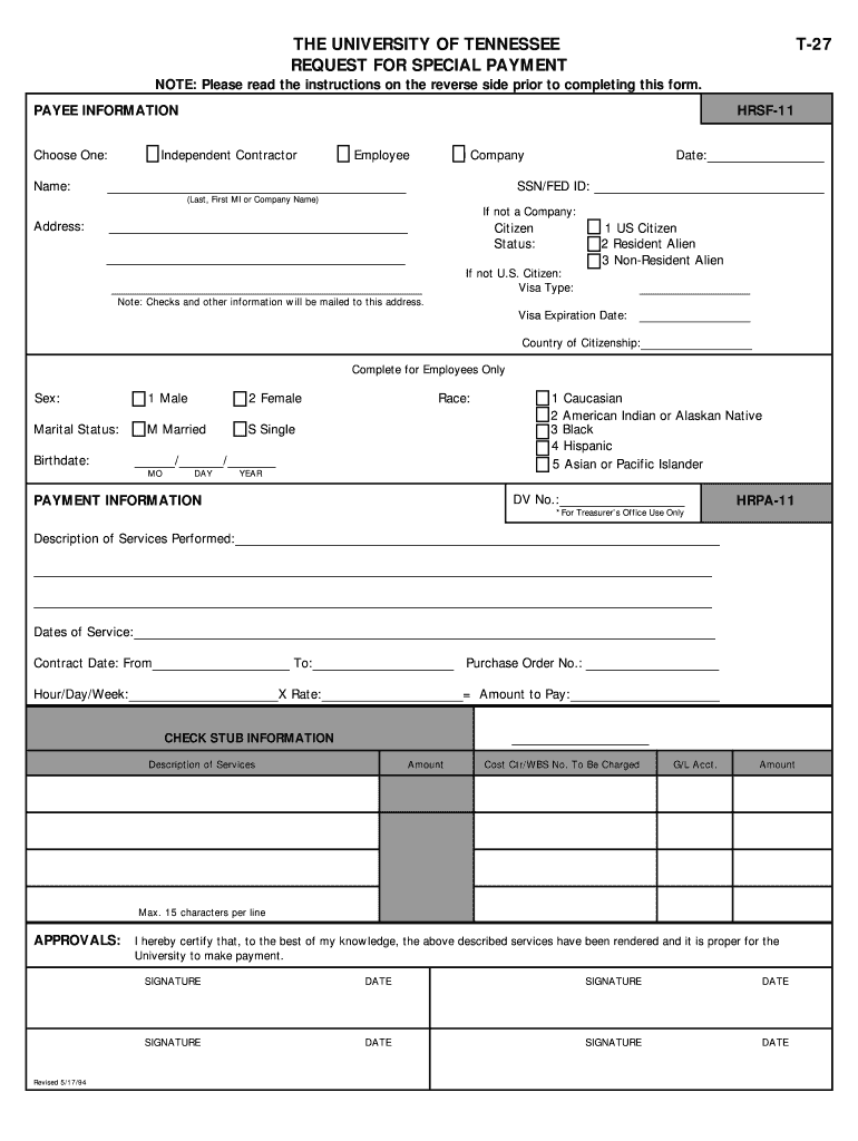 This document is used to request special payments for services rendered at the University of Tennessee, specifying whether the payee is an independent contractor or an employee and detailing payment