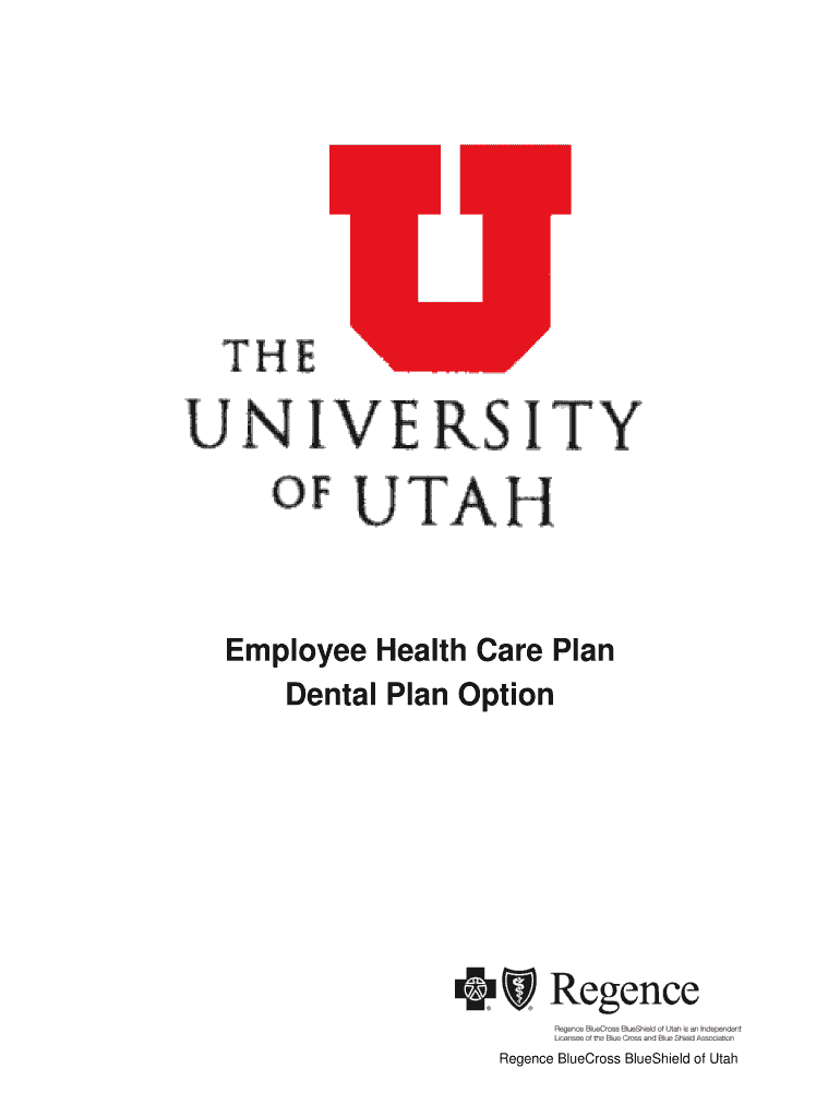 This document provides a summary description of the dental insurance benefits under the University of Utah Employee Health Care Plan, including eligibility, coverage details, claims administration,