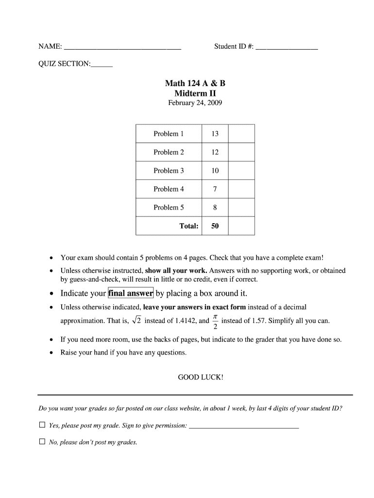 Get the free NAME: QUIZ SECTION: Student ID #: Math 124 A & - math washington