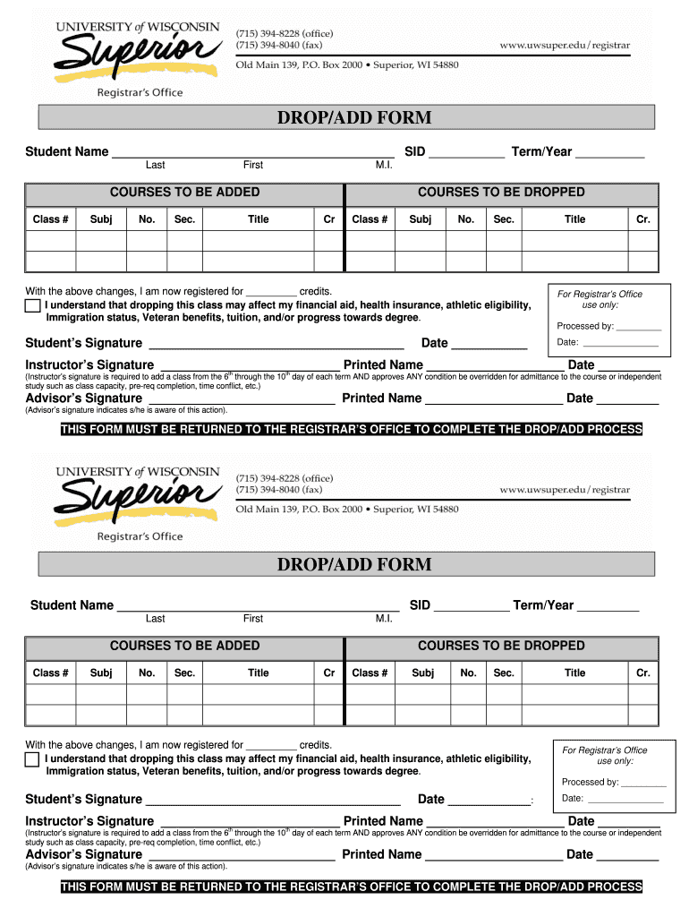 Once the Student Drop Add Form is completed, various methods are available for submission. Acceptable submission methods include: