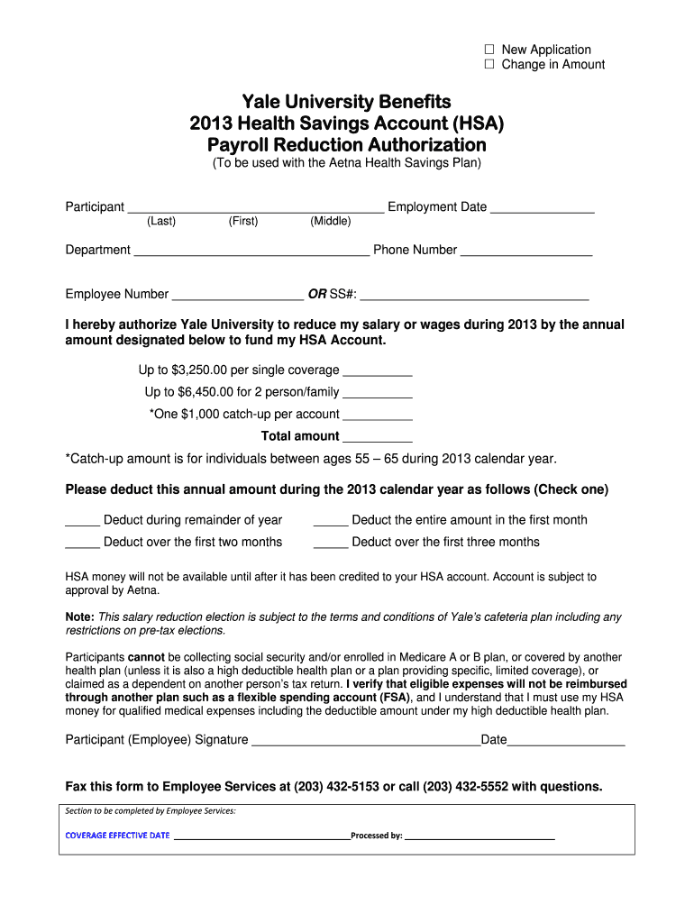 This document is used to authorize Yale University to reduce an employee's salary or wages to fund their Health Savings Account (HSA) for the year 2013.