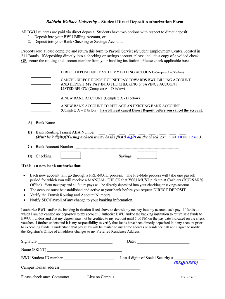 The Baldwin Wallace University Student Direct Deposit Authorization Form is intended for currently enrolled Baldwin Wallace University students who wish to set up direct deposit for their net pay.