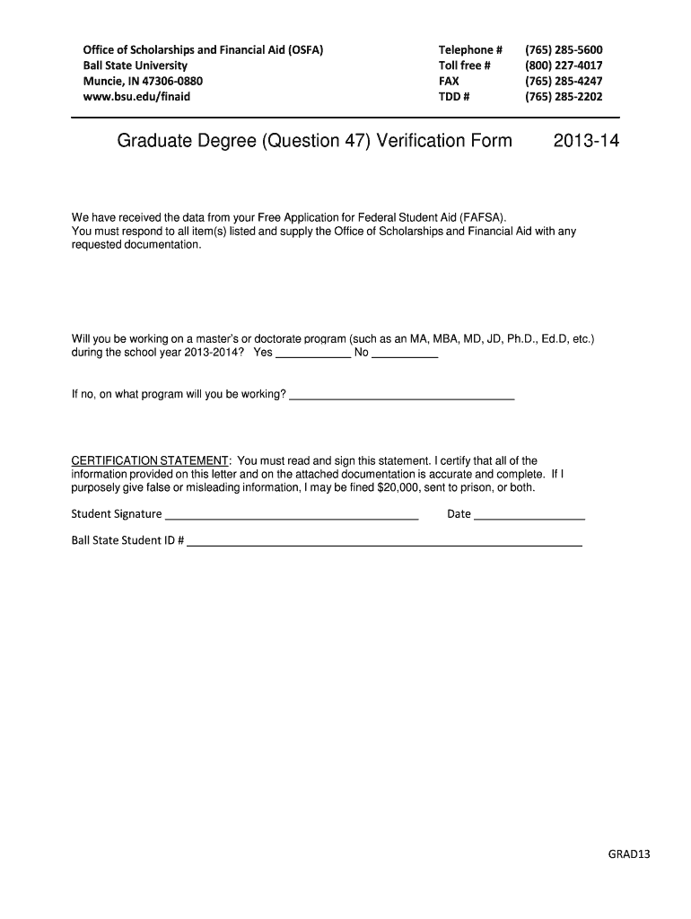 The Graduate Degree Verification Form 2013-14 is a financial aid application used by Ball State University to verify the graduate program status of students for the 2013-2014 academic year.