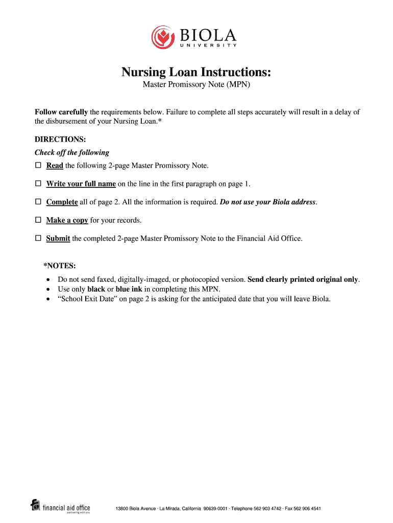 Get the free Nursing Loan Instructions: Master Promissory Note (MPN)