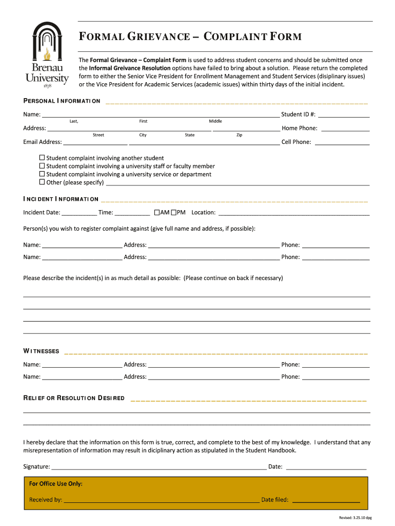 Get the free Formal Grievance – Complaint Form - intranet brenau