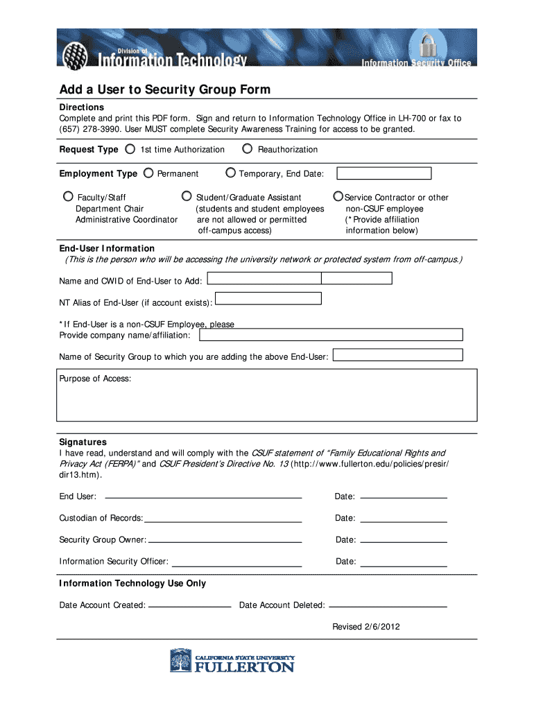 This form is used to request the addition of a user to a security group for access to the university network or protected systems. It requires completion by the end-user and submission to the Information