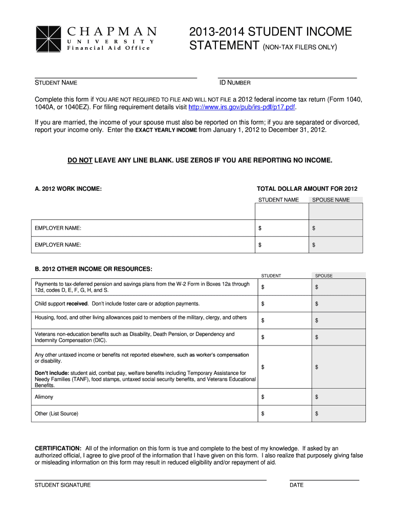 Get the free 2013-2014 STUDENT INCOME STATEMENT (NON-TAX FILERS ONLY) - chapman