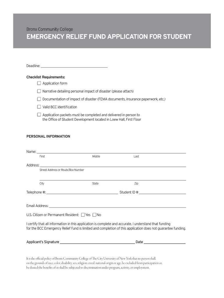 Application for students seeking financial assistance from the Bronx Community College Emergency Relief Fund, requiring personal information and documentation of disaster impact.