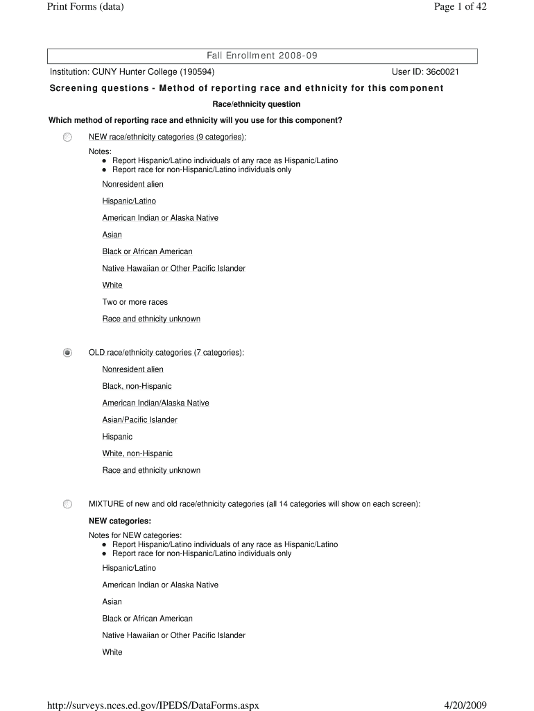 Este documento contiene datos sobre la inscripción de estudiantes en el Hunter College de CUNY para el año académico 2008-09, incluyendo preguntas de cribado sobre raza y etnicidad, selección