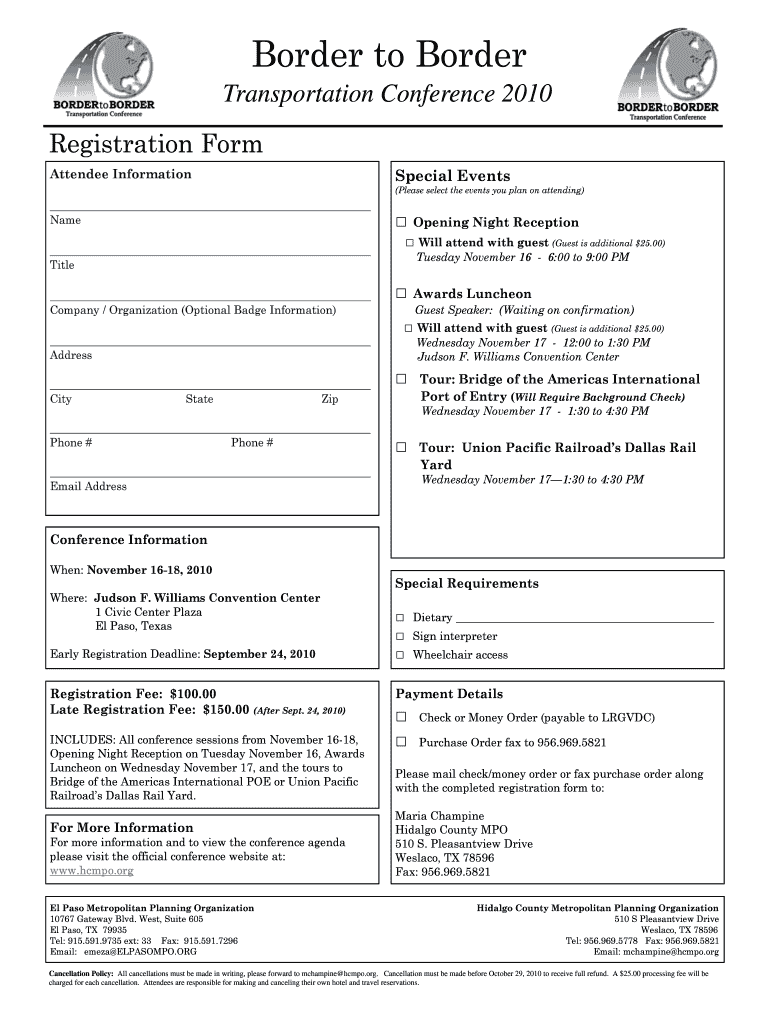 Border to Border Transportation Conference 2010 Registration Form Special Events Attendee Information (Please select the events you plan on attending) Name Opening Night Reception Title Company /