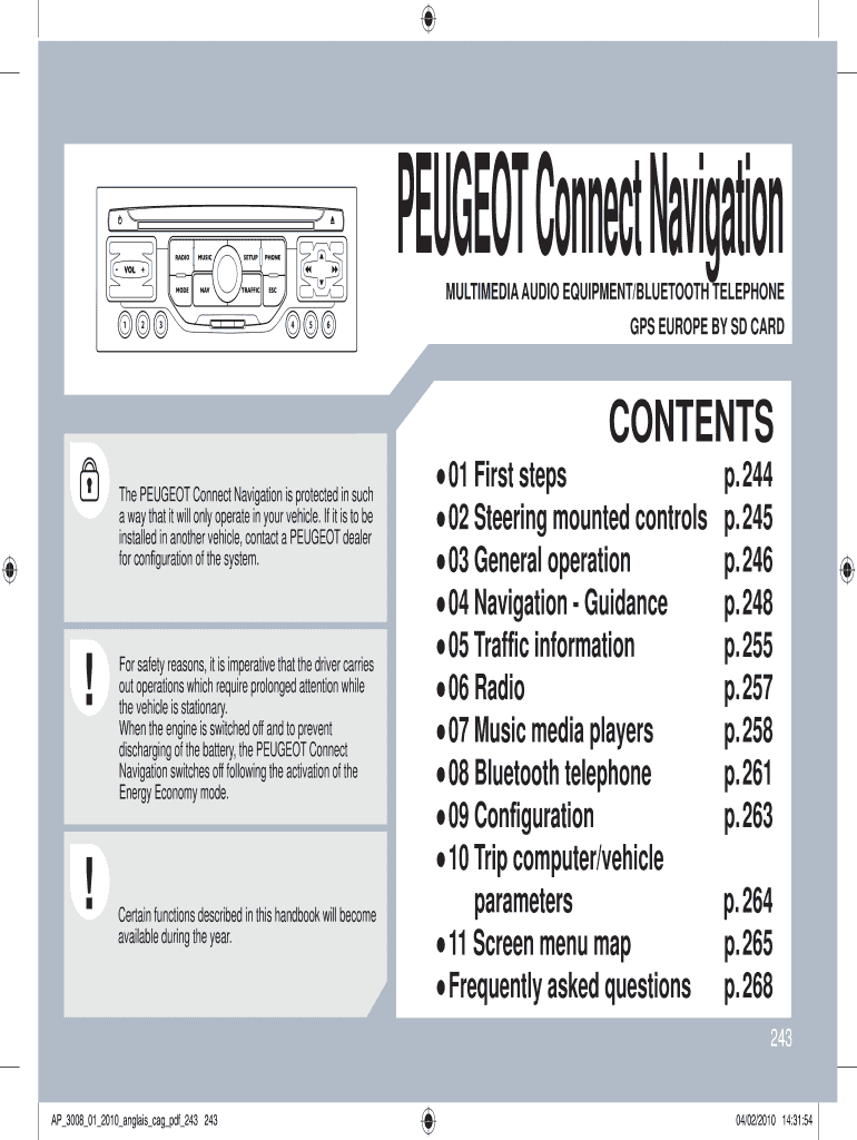 PEUGEOT Connect Navigation MULTIMEDIA AUDIO EQUIPMENT/BLUETOOTH TELEPHONE GPS EUROPE BY SD CARD CONTENTS The PEUGEOT Connect Navigation is protected in such a way that it will only operate in your