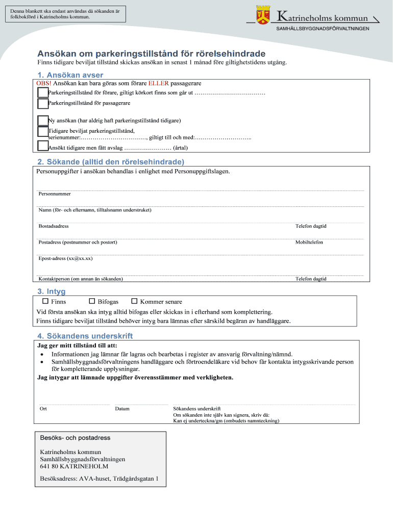 Get the free Blankett fr anskan om parkeringstillstnd - katrineholm