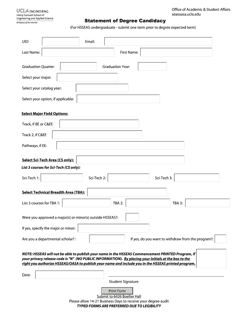 Office of Academic & Student Affairs seasons.UCLA.edu Statement of Degree Candidacy (For HS SEAS undergraduate submit one term prior to degree expected term) UID: Email: Last Name: First Name: Graduation