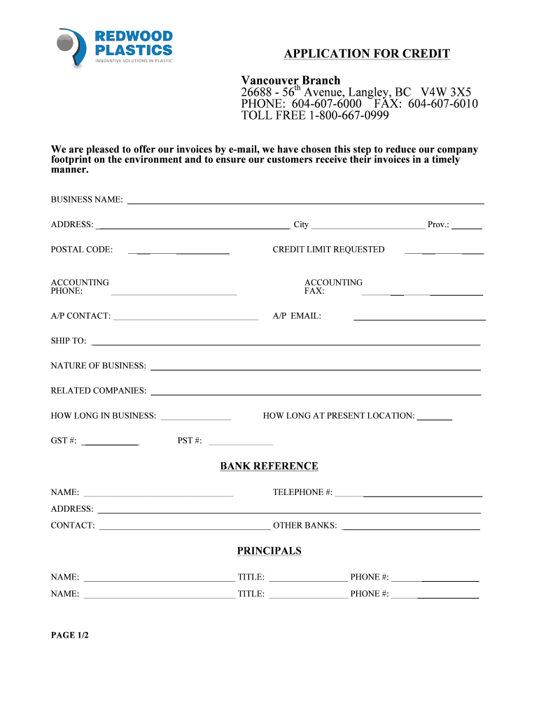 APPLICATION FOR CREDIT Vancouver Branch 26688 56th Avenue, Langley, BC V4W 3×5 PHONE: 6046076000 FAX: 6046076010 TOLL FREE 18006670999 We are pleased to offer our invoices by email, we have chosen