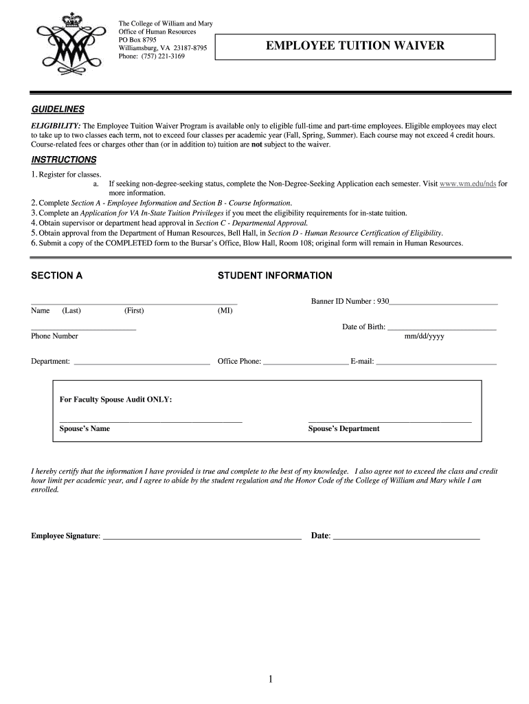 Get the free Employee Tuition Waiver - wm