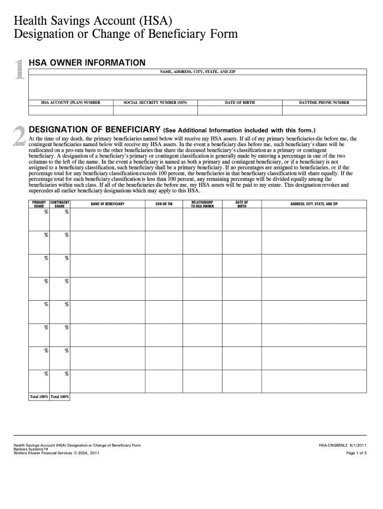 About Printing Requirements Reset Show Field Borders Health Savings Account (HSA) Designation or Change of Beneficiary Form HSA OWNER INFORMATION NAME, ADDRESS, CITY, STATE, AND ZIP HSA ACCOUNT (PLAN)