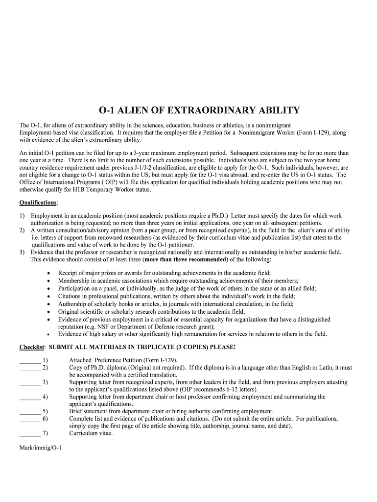 This document outlines the requirements and process for obtaining an O-1 visa for individuals of extraordinary ability in various fields including sciences, education, business, and athletics. It