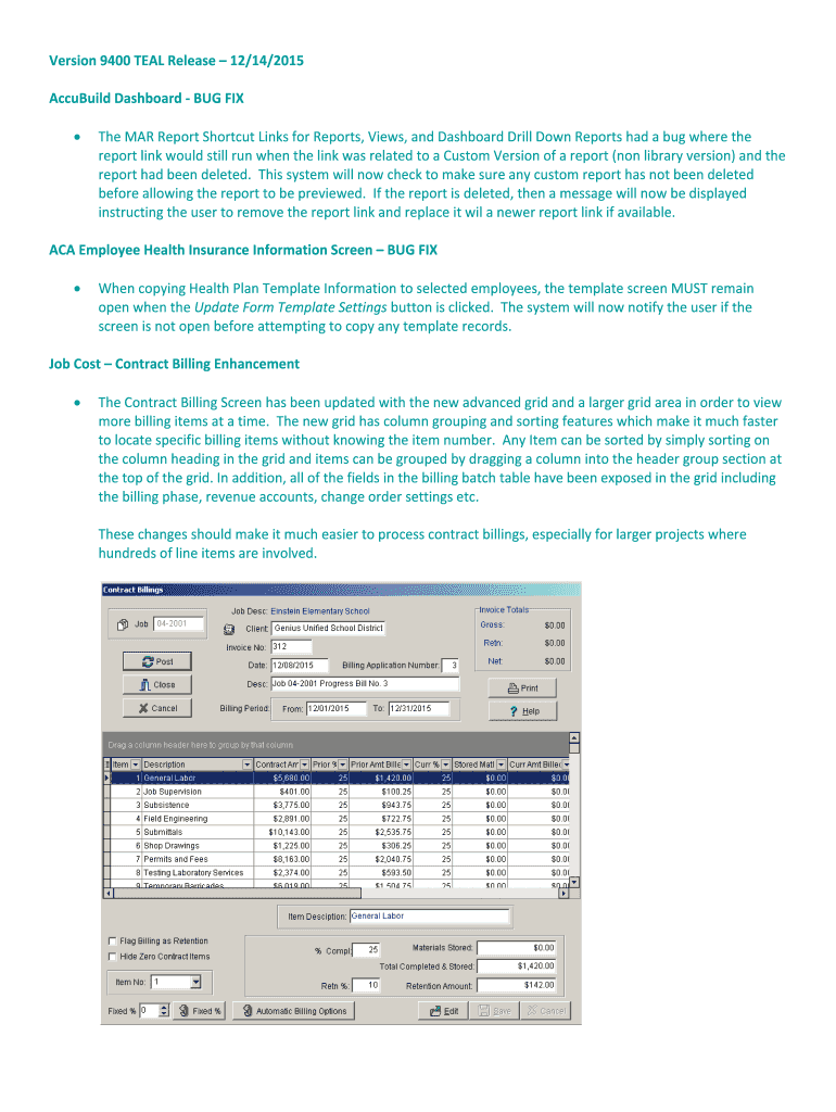 Version9400TEALRelease12/14/2015 AccuBuildDashboardBUGFIX TheMARReportShortcutLinksforReports, Views, andDashboardDrillDownReportshadabugwherethe reportlinkwouldstillrunwhenthelinkwasrelatedtoaCustomVersionofareport(nonlibraryversion)and