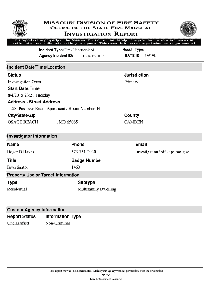 Incident Type: Fire / Undetermined Agency Incident ID: 0804150077 Result Type: BATS ID: i 386198 Incident Date/Time/Location Status Investigation Open Jurisdiction Primary Start Date/Time 8/4/2015