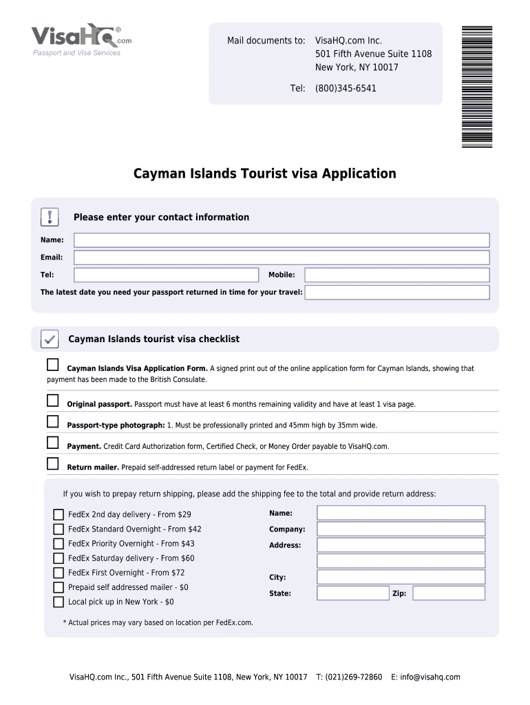 Mail documents to: Tel: VisaHQ.com Inc. 501 Fifth Avenue Suite 1108 New York, NY 10017 (800)3456541 Cayman Islands Tourist visa Application Please enter your contact information Name: Email: Tel: