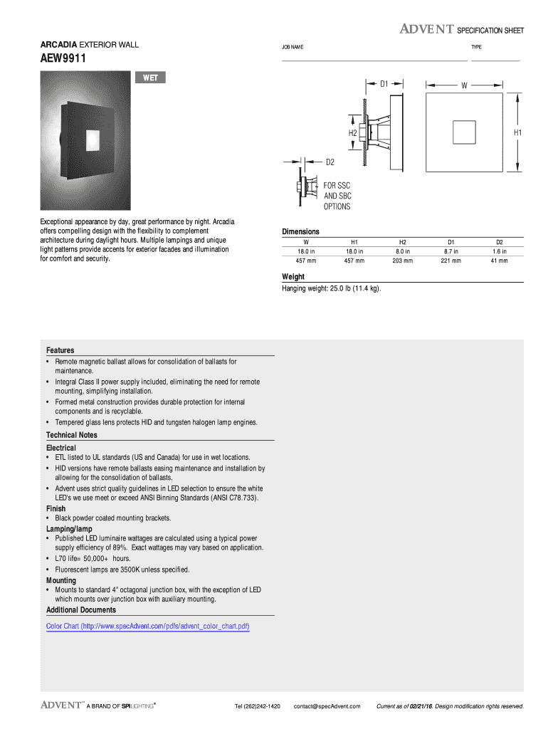 ADVENT SPECIFICATION SHEET ARCADIA EXTERIOR WALL JOB NAME TYPE AEW9911 WET Exceptional appearance by day, great performance by night. Arcadia offers compelling design with the flexibility to complement
