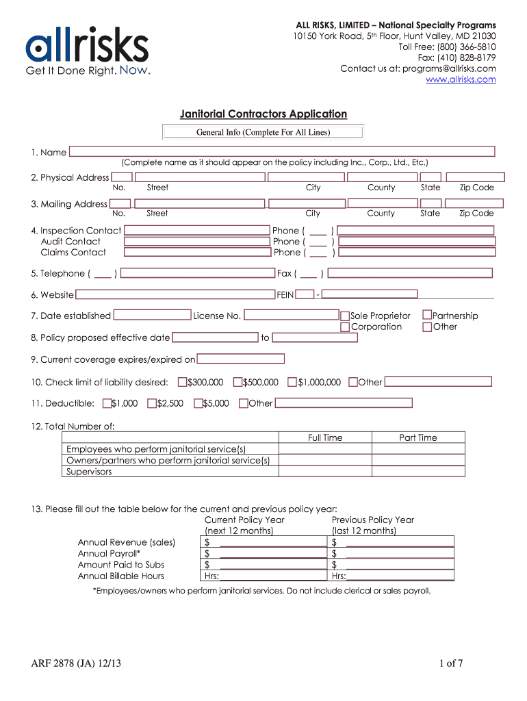 Get the free Janitorial Contractors Application 4 ARF 2878 JA 1213 bb - All Risks